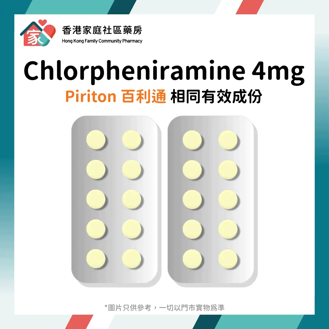 - 供應情況: 葛蘭素史克(GSK)生產的 Piriton 品牌藥片在香港已停止供應多年,目前市面上藥房及醫院主要使用由不同藥廠生產的同成份學名藥(Generic Drugs),即本產品