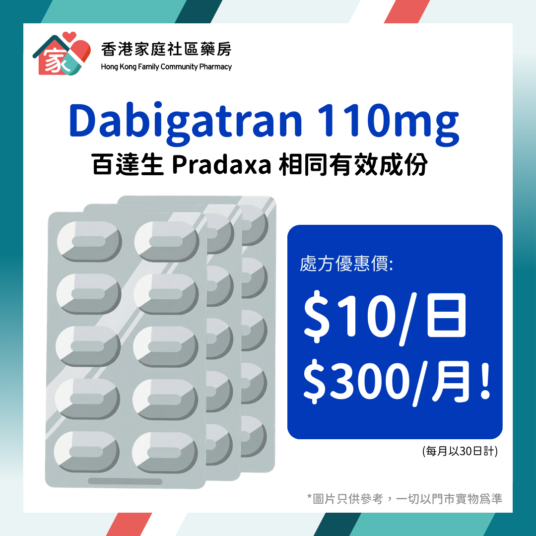 如希望購買Dabigatran 110mg Capsule|百達生 Pradaxa 相同有效成份,請在到訪前預先 WhatsApp 我們香港家庭社區藥房查詢最新的優惠價錢及存貨狀況。