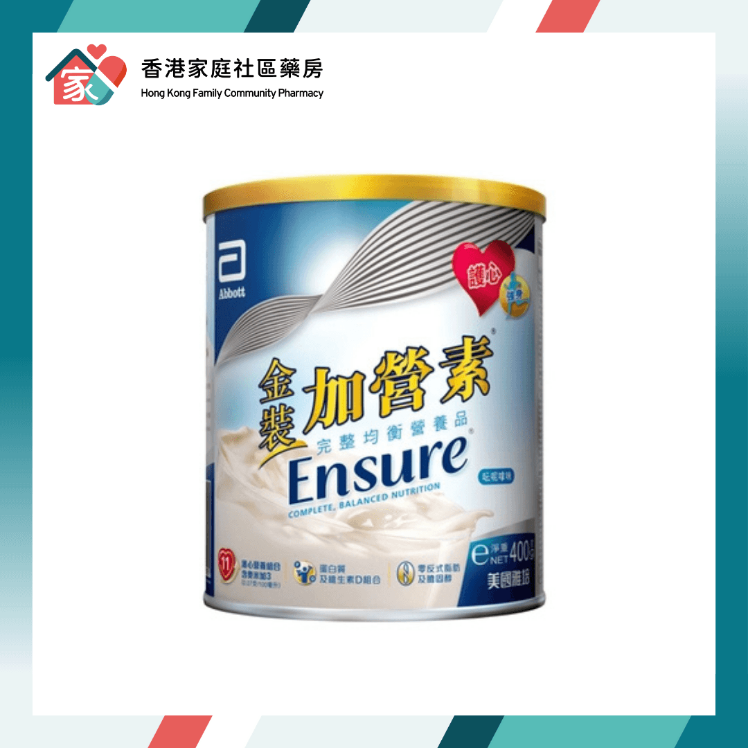 Abbott Ensure 雅培 金裝加營素 400g(細罐優惠裝) 現於香港家庭社區藥房有售。