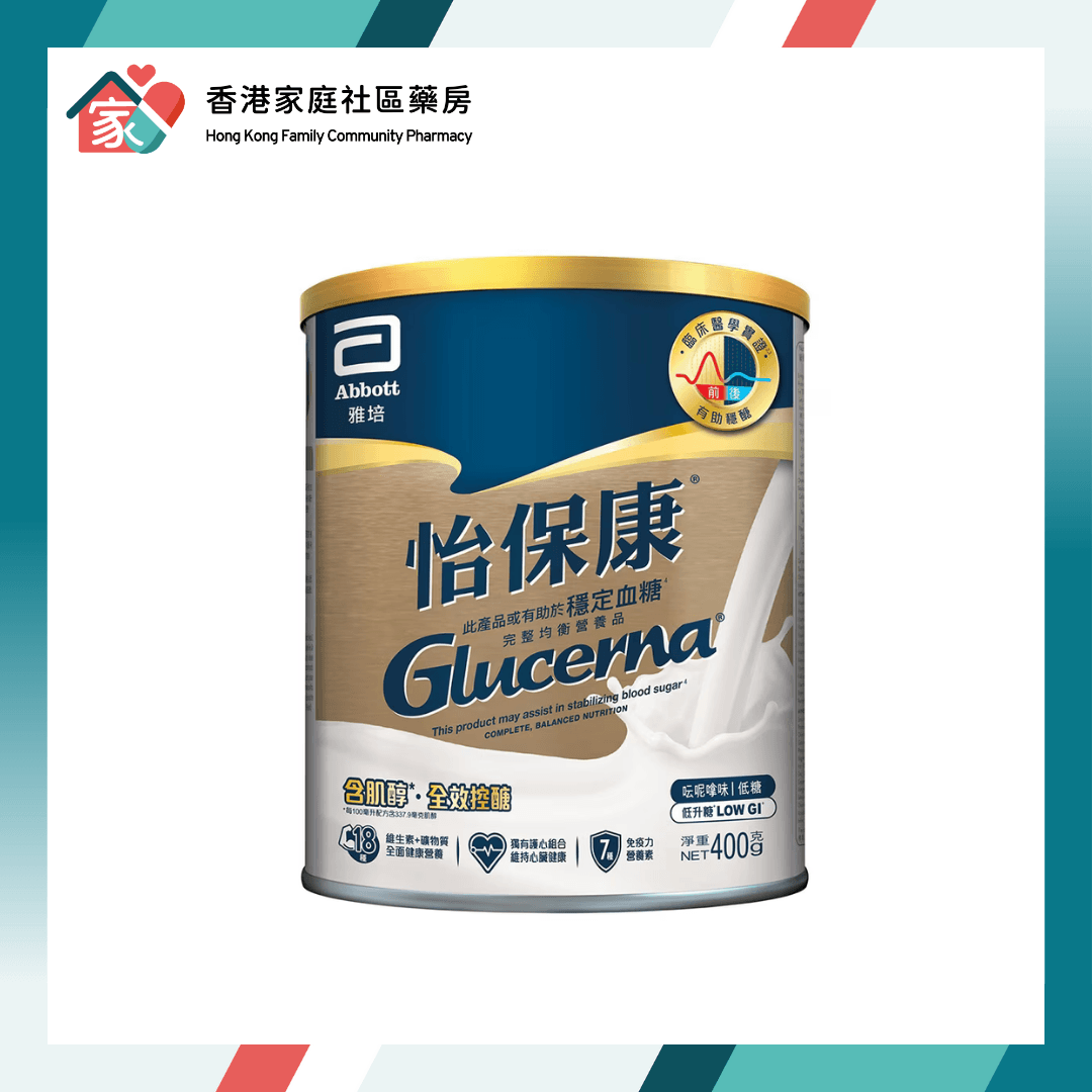 Abbott Glucerna 雅培 怡保康 400g(細罐優惠裝) 現於香港家庭社區藥房有售。