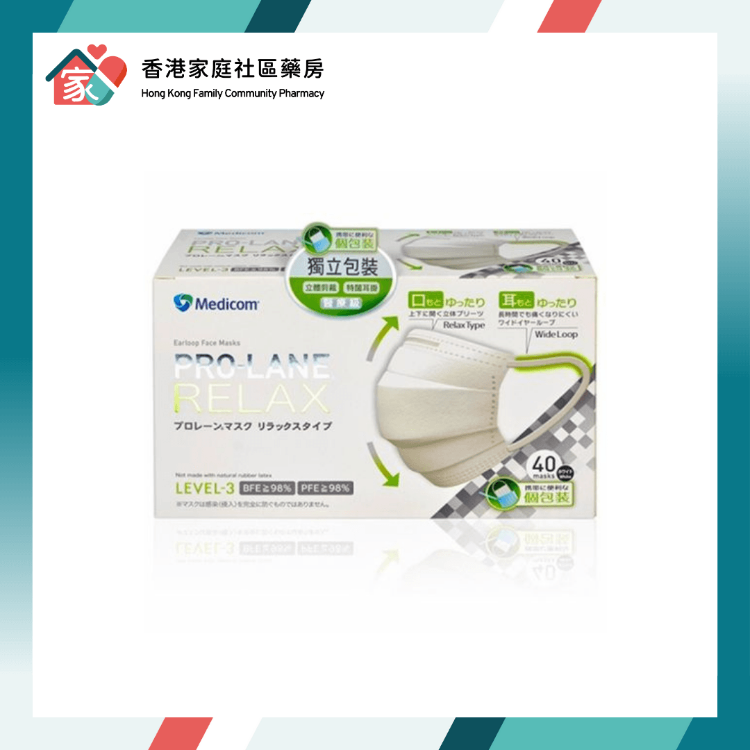 Medicom Pro-lane Relax Level 3 成人醫用口罩 40個獨立包裝(白色) 現於香港家庭社區藥房有售。