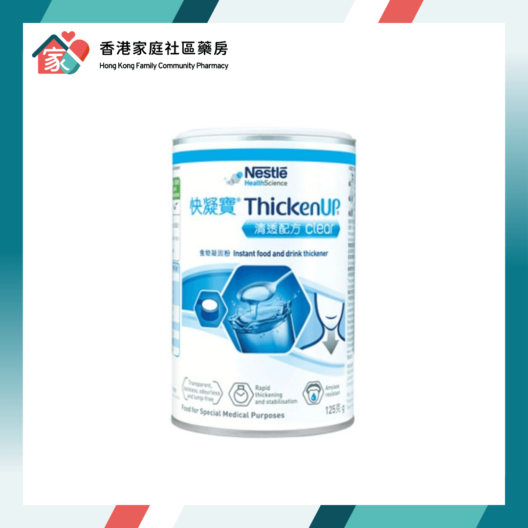 ThickenUP Clear 雀巢 快凝寶 清透配方食物凝固粉是一種為吞嚥困難人士設計的食物凝固粉。可以加於食品或飲品中,調配成不同的黏稠度,方便進食。此配方採用黃原膠,有較高的穩定性。