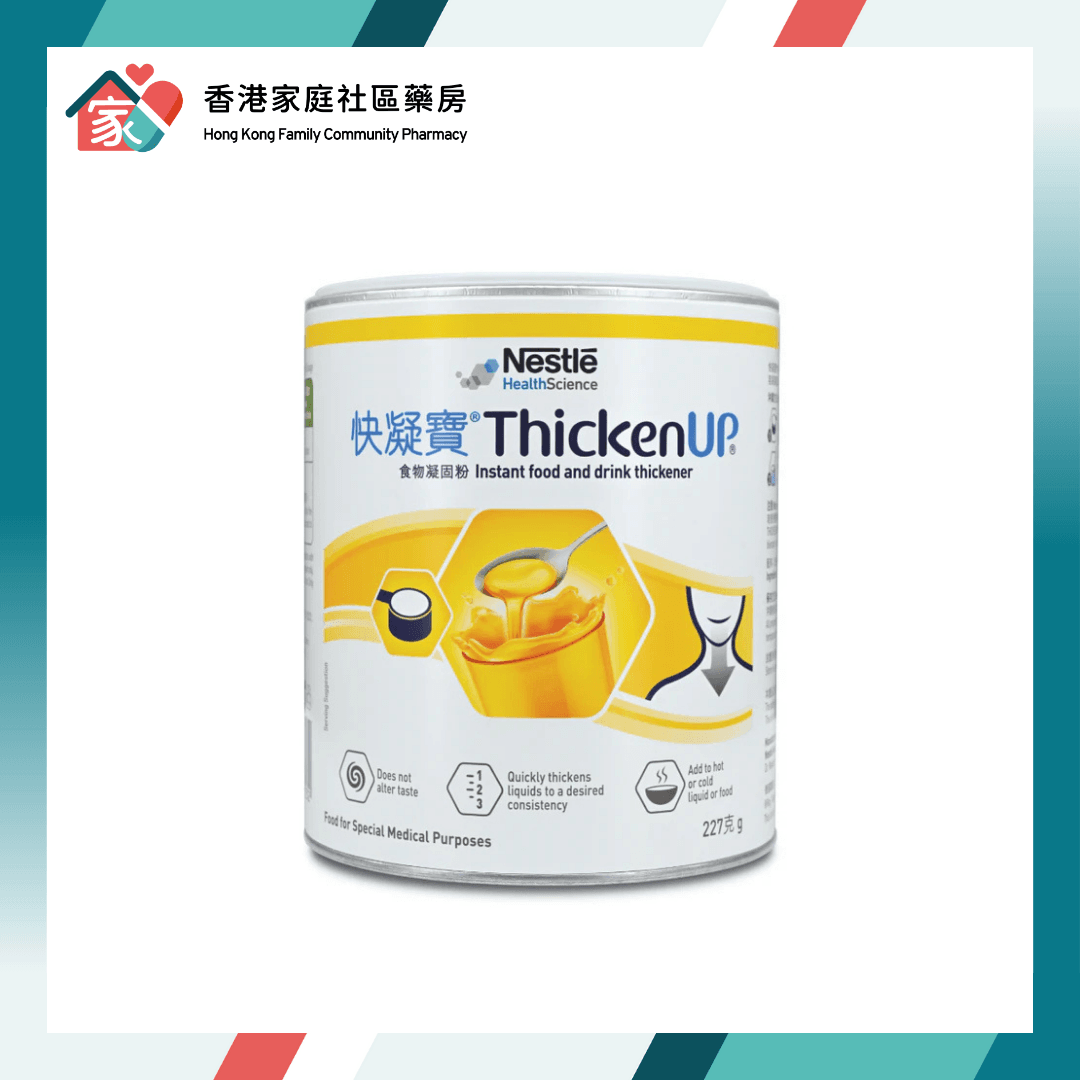 ThickenUP 雀巢 快凝寶 食物凝固粉(澱粉配方) 現於香港家庭社區藥房有售。